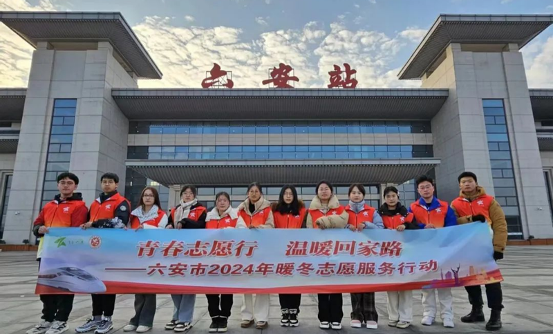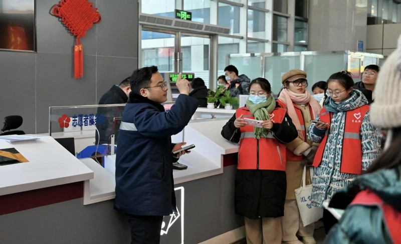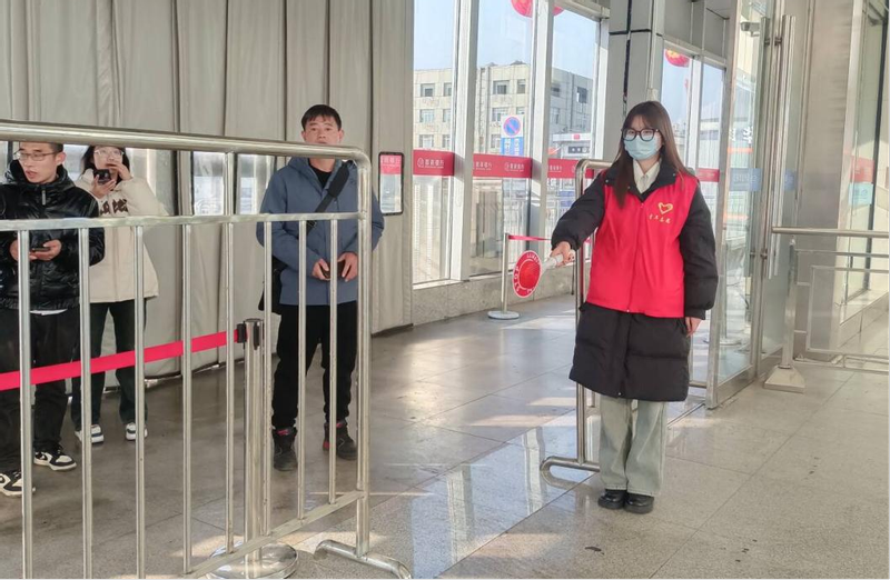 【六安站】在志愿服务台、售票机旁、出发、到达大厅里,处处能看到凛冬花志愿者们忙碌的身影。团队成员晁倩倩有条不紊地进行着高铁班次咨询、乘客行李搬运、进出站引导、票务问题处理等服务。一次次贴心服务、一声声关切问候,为这个冬日增添一抹青春“志愿红”。