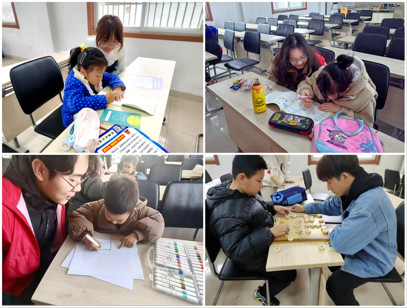 辅导课程结束后,队员与小朋友们开展了象棋比拼、你画我猜等益智游戏,这是小朋友们最喜欢的环节,部分成员也针对小朋友开展练字与绘画,培养小朋友们的兴趣爱好。寓教于乐,在欢声笑语中一同度过快乐的时光。