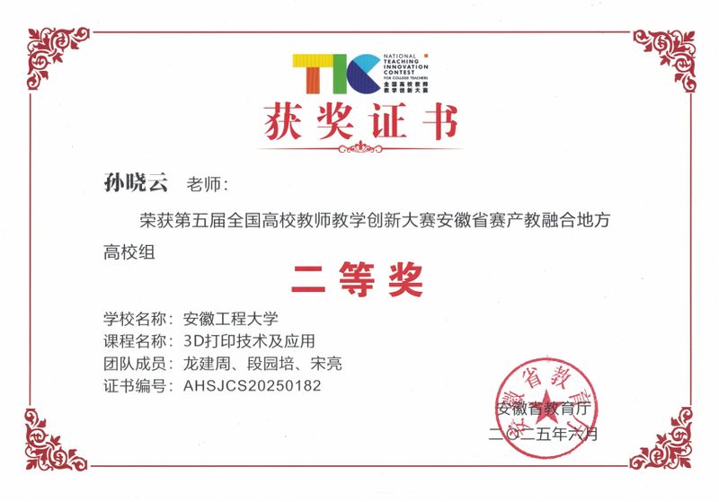 近年来,获省级一流课程1门,省级“AI+教育”课程1门,校级一流课程4门,校级课程思政优质课16门,校级项目式课程1门,校级校企合作共建课程1门。编写《金属塑性成形技术基础及CAE工程应用》《3D打印实用教程》《冲压工艺与模具设计》《增材制造与再制造的原理及应用》等多部教材。