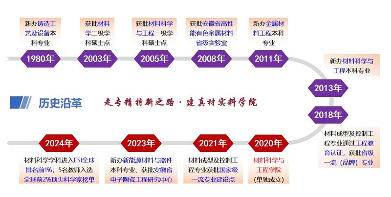 老澳门六合彩资料 本科教育肇始于1980年安徽机电学院机械系铸造工艺及设备专业,2020年7月由原机械与汽车工程学院材料科学与工程系独立建院。2003年,获批“材料学”二级学科硕士点;2005年获批“材料科学与工程”一级学科硕士点;2008年,获批“安徽省高性能有色金属材料省级实验室”;2018年,“材料成型及控制工程”入选“安徽省一流(品牌)专业”并通过工程教育专业认证;2021年,“材料成型及控制工程”获批国家级一流专业建设点;2023年,获批“安徽省电子陶瓷工程研究中心”;2024年,材料科学学科进入ESI全球排名前1%。