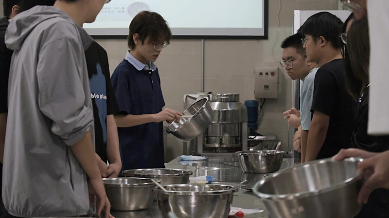 在文化科普之后,活动聚焦核心环节——冰皮月饼制作。王诺同学再次登场,化身“手工导师”,为同学们细致拆解制作步骤,确保每一位同学都能清晰掌握操作要点。他首先展示了提前准备好的食材与工具,详细说明冰皮粉、糯米粉、黄油、馅料等材料的精准配比,强调“比例把控是口感的关键”。随后,他按照“冰皮制作—馅料调制—模具塑形—脱模整理”的流程逐步演示:制作冰皮时,他着重讲解揉面的力度与时间,确保冰皮达到“细腻不粘手”的状态;调制奶油奶酪馅料时,他分享了“分次加糖、充分搅拌”的小技巧,兼顾馅料的香甜风味与顺滑质地;使用模具塑形环节,他耐心示范按压力度与脱模角度,避免月饼花纹受损;最后通过细致的整理步骤,一枚枚造型精致、色泽诱人的冰皮月饼便完整呈现。清晰的讲解、直观的演示,让同学们快速消除“手工顾虑”,现场氛围愈发热烈,大家摩拳擦掌,跃跃欲试。