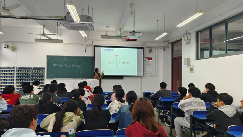周冬梅代表社团对新成员的加入表示热烈欢迎。她以“传承科学精神,深耕材料领域”为核心,系统介绍了材料科学社的社团宗旨——致力于为热爱材料科学的学子搭建学术交流、实践创新的平台,助力成员提升专业素养与创新能力。她还结合社团历年发展历程,回顾了在学术讲座、实验实操、竞赛孵化等方面取得的成果,并详细讲解了社团日常活动安排,包括定期学术沙龙、实验室开放体验、行业前沿分享会等,让新成员对社团运作有了全面清晰的认知。