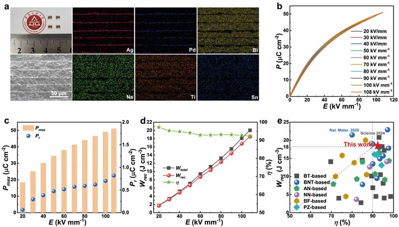 发表于《Advanced Science》的研究则以反铁电/铁电共存的NaNbO3陶瓷为基体,通过高熵组成设计,在弛豫铁电体中构建出“准反极性纳米团簇”结构。该结构不仅削弱了周围极性纳米微区之间的耦合,还在外加电场下表现出不同于极性纳米微区的相变行为,从而实现了低滞后、类线性的极化-电场响应。最终制得的NaNbO3基无铅MLCC原型器件具备优异的综合储能性能:储能密度为~18.3 J·cm-3,储能效率约91.5%,储能密度/测试电场比值达0.25 J/(kV·mm-5)。